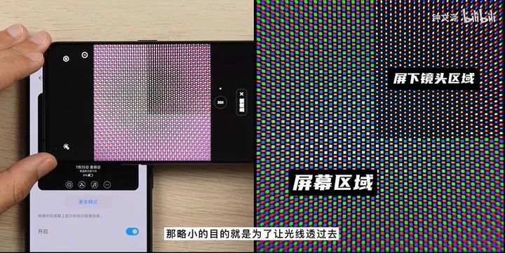 我们将一块屏幕看做一件毛衣,为了进光量,需要将摄像头区域的毛线拉开,让毛线与毛线之间存在空隙,这也是为何摄像头区域的子像素看起来比屏幕区域的要“稀疏”,但这就会造成摄像头区域显示不够清晰,甚至出现色差。