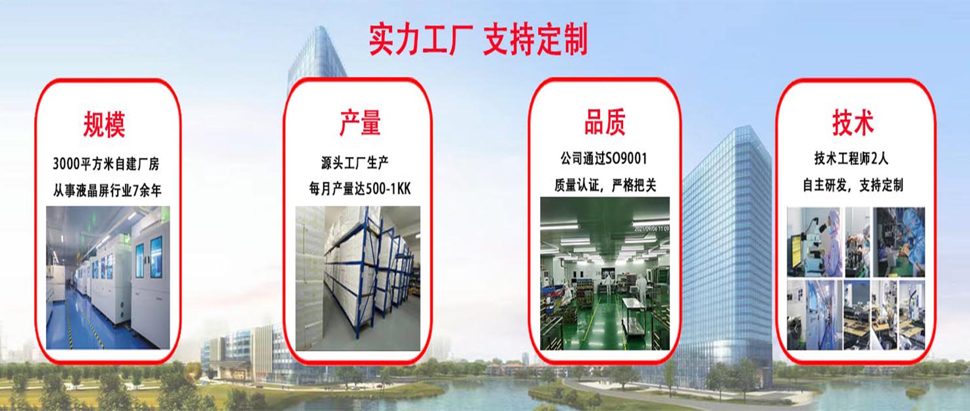 深圳工厂现有员工200余人,公司拥有多名从事行业研发多年的工程师,厂房面积6000多平方米,标准无尘车间3000多平方米,拥有3条自动模组生产线,月产能800-1000k.公司2016年获得国家高新企业;2017通过IS09001:2015体系认证. 公司凭借行业内资深的人才和技术的优势,并结合自身诚信第一,质量第一,服务第一的经营理念,以及对于产品的严谨态度,现已成为单个行业知名的产品综合制